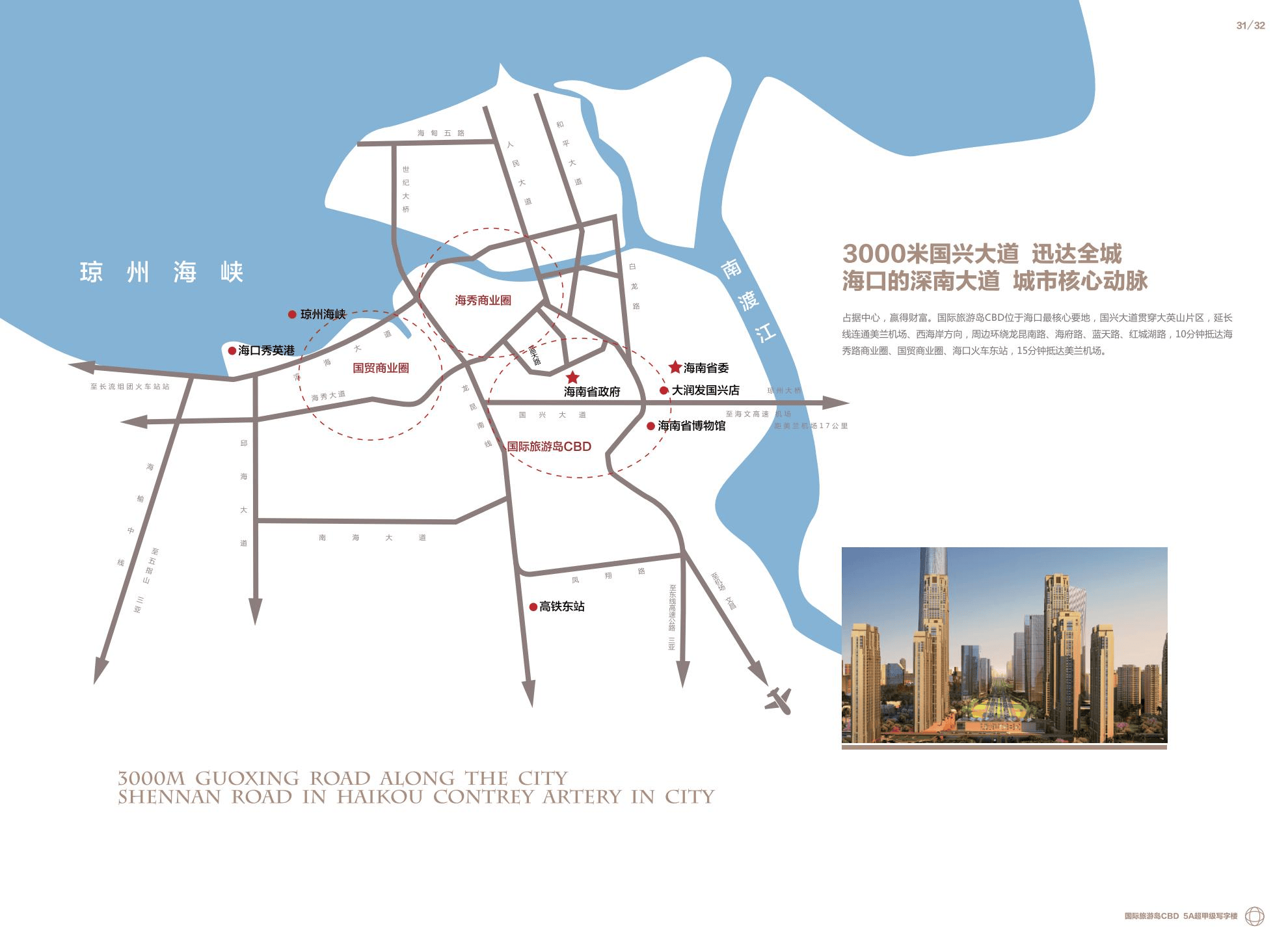 【城市主干道】13车道国兴大道,周边环绕海秀快速路,龙昆南路,蓝天路,海府路,红城湖路等。